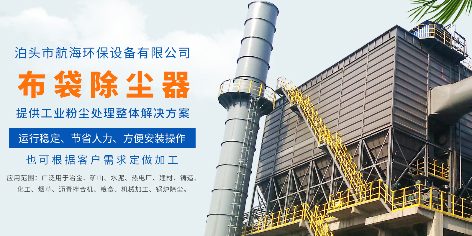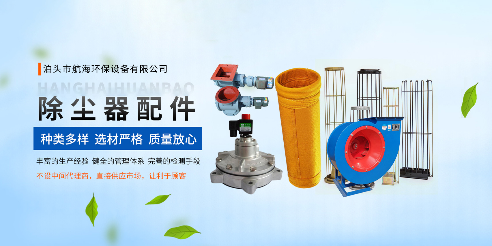 航海環(huán)保設(shè)備有限公司主要生產(chǎn):布袋除塵器,單機(jī)除塵器,旋風(fēng)除塵器,脫硫除塵器,木工除塵器,鍋爐除塵器,礦山除塵器,靜電除塵器等除塵設(shè)備,以及除塵器骨架,除塵器布袋,星型卸料器,電磁脈沖閥,通風(fēng)蝶閥,粉塵加濕機(jī),斗式提升機(jī)等各種除塵器配件:工量具,墊鐵,減震器,產(chǎn)品適用于:電廠,鋼廠,冶金,水泥,糧食,家具廠,耐火材料,焚燒,拋光,金屬加工,塑料加工,木材加工,化工,涂料等領(lǐng)域。我公司技術(shù)力量雄厚、質(zhì)量管理嚴(yán)格、生產(chǎn)制造精良、售后服務(wù)優(yōu)異,多年來一直深受客戶的好評,以優(yōu)良的除塵產(chǎn)品和完善的服務(wù)著稱于國內(nèi)外。公司不斷加強(qiáng)管理,不斷拓展銷售渠道建立了從設(shè)計、開發(fā)、生產(chǎn)、安裝和服務(wù)的質(zhì)量保證模式。